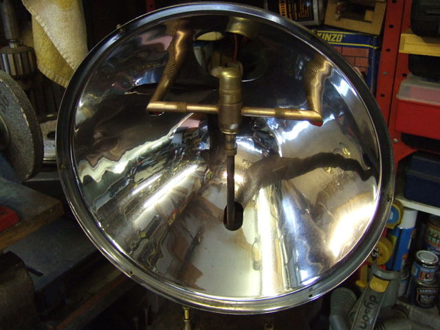 Good grief Stu, what a task. Shaping up well though. The reflector appears to have unblemished silvering, surprising given the life the lamp must have had judging by the ravages of the tin worm on the ferrous bits. Alas, I've no spare rim to divvy up. John