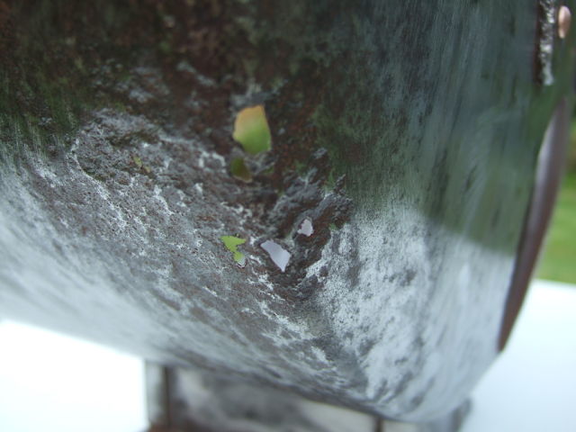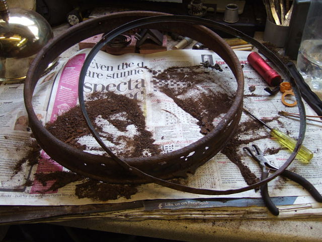 The next installment is just the resin red oxide paint being applied to the fount after the Kurust treatment , this is the first coat & tomorow i'll flat it back with wet & dry then recoat it starting to look a little better Unfortunately the metal surround that holds the glass is in quite a bad state & i think i will need to make a new outer rim & secure it over the badly holed steel , then re-drill the holes for the inner glass holder Just started to clean up the cast support & the main lamp body If anyone has any better ideas on the rim repair or has a spare please sing out Stu