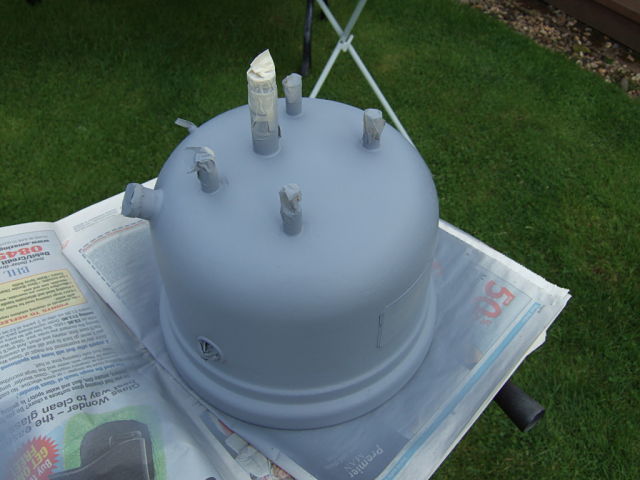 Hi All The fount was still looking a bit dimply after several coats of red oxide paint so i took some wet & dry sanding paper & took as much of the bumpy surface off as possible leaving it looking like this Next several coats of grey primer which were flatted down in between each one to give a much better finish , it's still not perfect with plenty of blemishes but nowhere near as bad as when i started Also have rebuilt the pump & the control cock / vapouriser assembly , if you look next to the control cock you'll notice the original metal mesh sock filter as this early type have no screw on filter , i don't know but are these still available & the pump has a spring mounted in between the handle & pump cap as the pump rod seems slightly too long even after adjustment , now gives a nice smooth action 8) I'll let the primer dry for a day or so before i think about putting on a topcoat or two , i have some new black engine laquer as i have finally found traces of black paint on the brass tank riser Starting on the main lamp body soon Best regards Stu